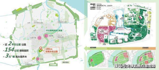 约200万方世博文化公园+前滩百万方公园群+三林绿地,共构成约700万方滨江公园,成就滨江双S湾最大的百万方公园群