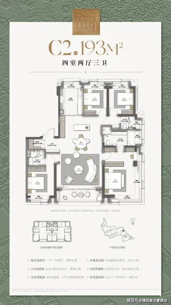 主力户型:为建面约 120-240㎡的三至四房,全社区一梯一户设计,得房率超 80%。