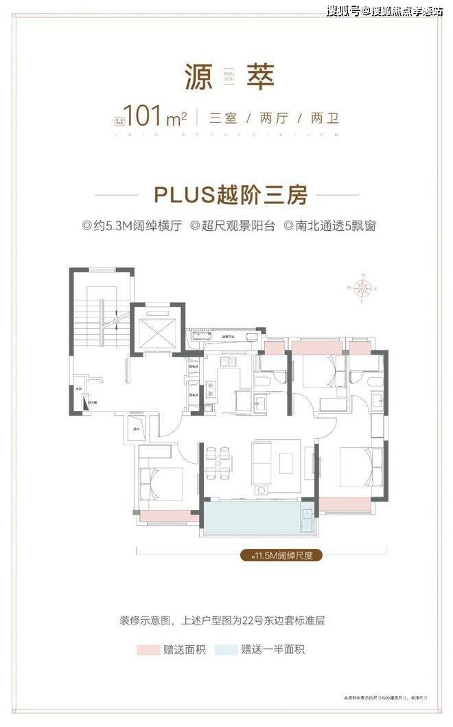 经典飞机户型+三开间朝南+餐客厨一体化+约5.3m的阔绰横厅,整体南向面宽达到约11.5m!整个户型的通透度和采光度很棒。