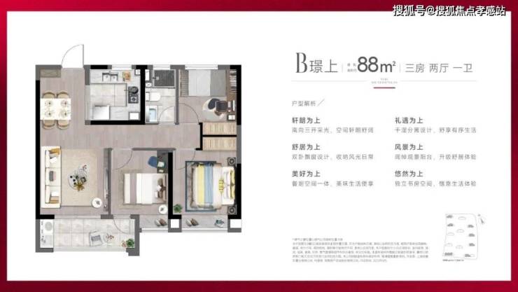 【深业·深安上居 】售楼处预约热线:400-8855-420📲该户型在88㎡户型的基础上,将尺度进行了升级,双卫设计,三开间朝南+动静分离,室内采光面非常大,通透明亮。
