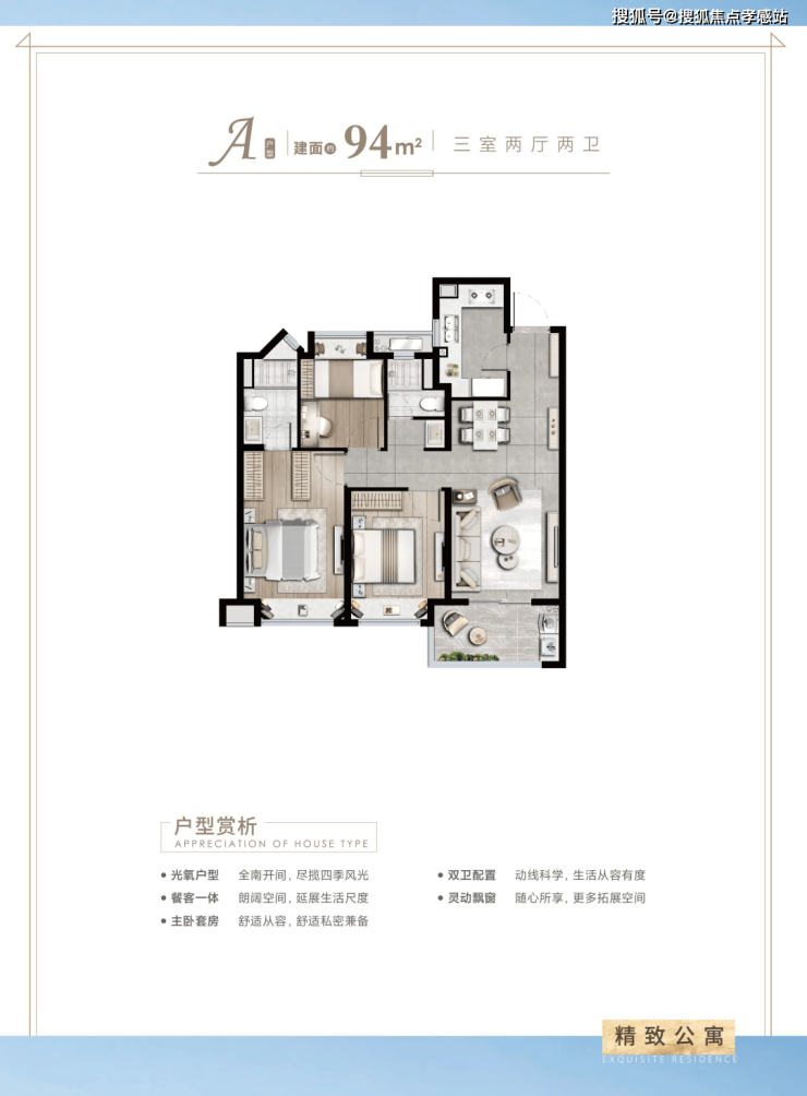 ⭐ 同润·新云都会售楼处热线☎️☎️:400-9966-940✔✔ 建面约94㎡3房2厅2卫户型特点:做到了三开间朝南+主卧套房设计+全卧飘窗+动静分离+卫生间干湿分离,功能性与空间感完美结合的3房“神户型”。