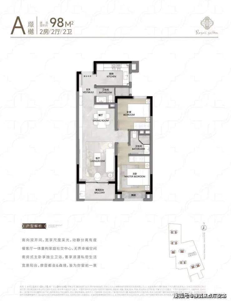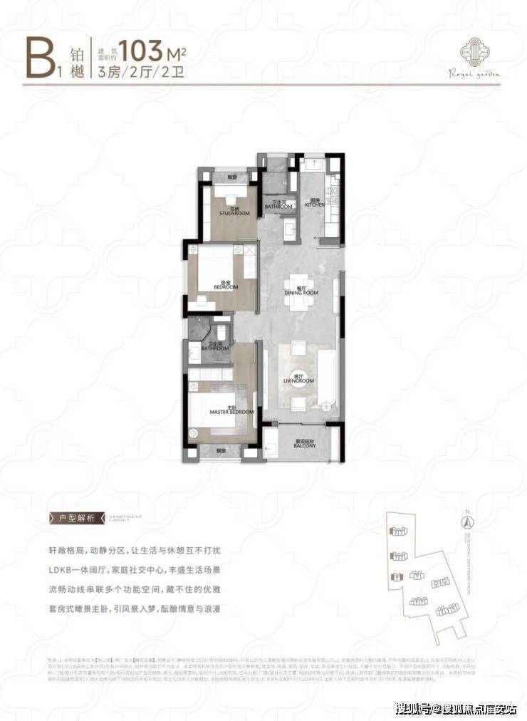 104㎡3户型特点:该户型多为楼栋的东边套,是一个观景户型。客厅连接270°阳台,视野出众。双卧朝南,阳光满溢。从次卫布局看,如果家庭人口较少,该户型还能做成双套卧。