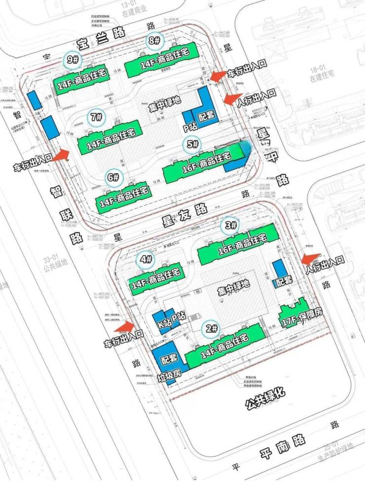 根据设计方案显示,项目拟建6栋层高14F和2栋层高16F商品住宅,1栋层高17F的保障房,网传可售房源约550套+。