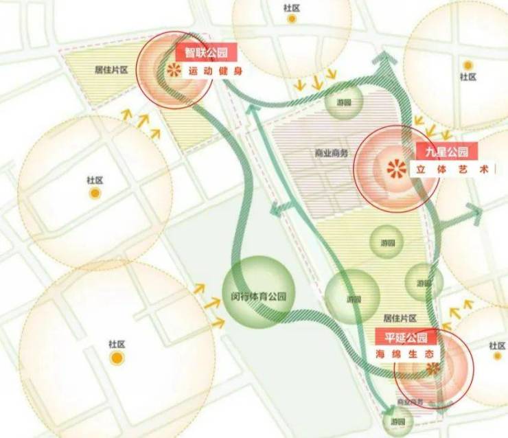 据悉,未来将建成九星片区内的三大公园,近150万方生态公园串联起一个都会生活绿轴,将承载着改善九星乃至七宝地区的作用。
