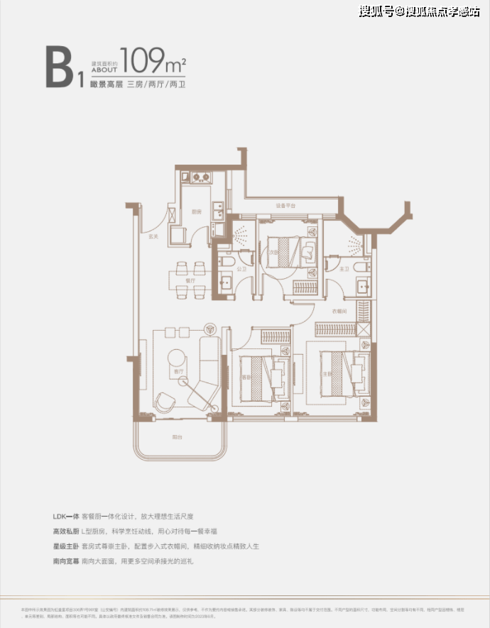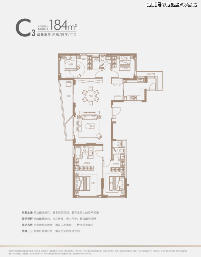 建面约140㎡四房:三开间朝南户型,南北通透,采光条件优质,客厅明亮宽敞,彰显大气布局。