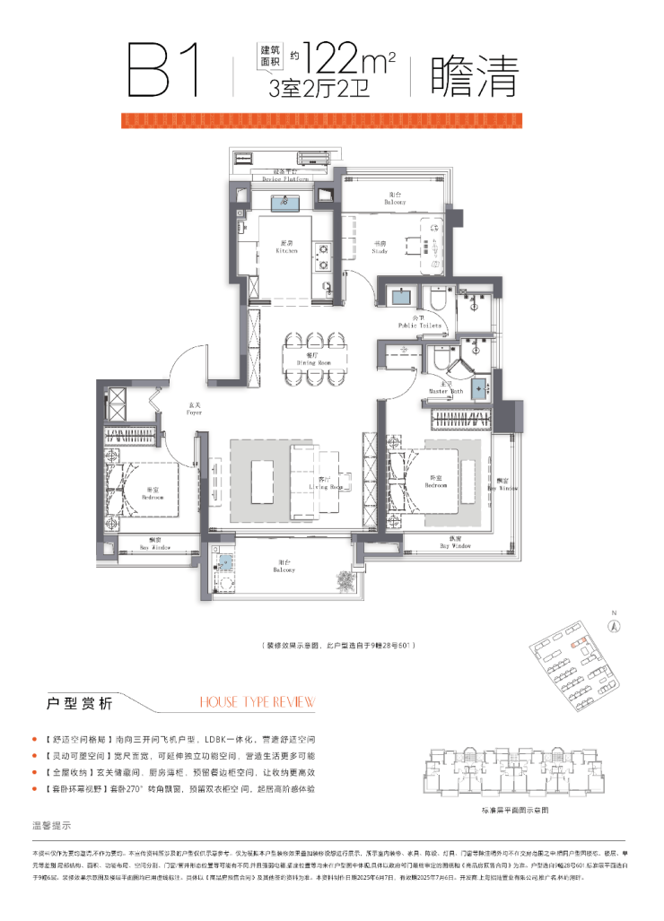 该户型为四开间朝南,独立入户玄关,南北直通,客厅面宽约4.6米,客厅+南次卧+北房间均带阳台,边套户型主卧为270°飘窗,中间套与边套户型的区别主要也就是有无主卧飘窗!
