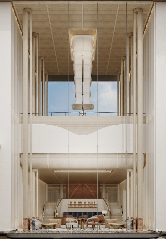 公区建筑片墙近人尺度内,运用大块切割打磨沙漠风高级米黄石材,雕琢高级沙砾感和肌理,整石旋转10cm递差叠砌,不计废料只为呈现卢浮宫金字塔式的微妙角度,檐口巧藏灯带,予以细腻温润的质感体验;浮光门庭以6毫米超薄铝板勾勒飞檐,营造飘逸轻盈的度假意境。