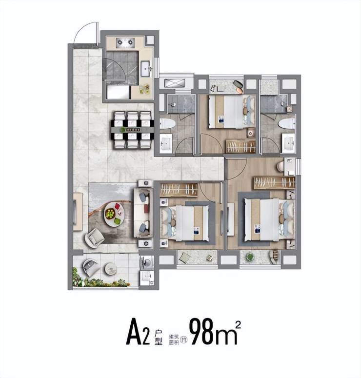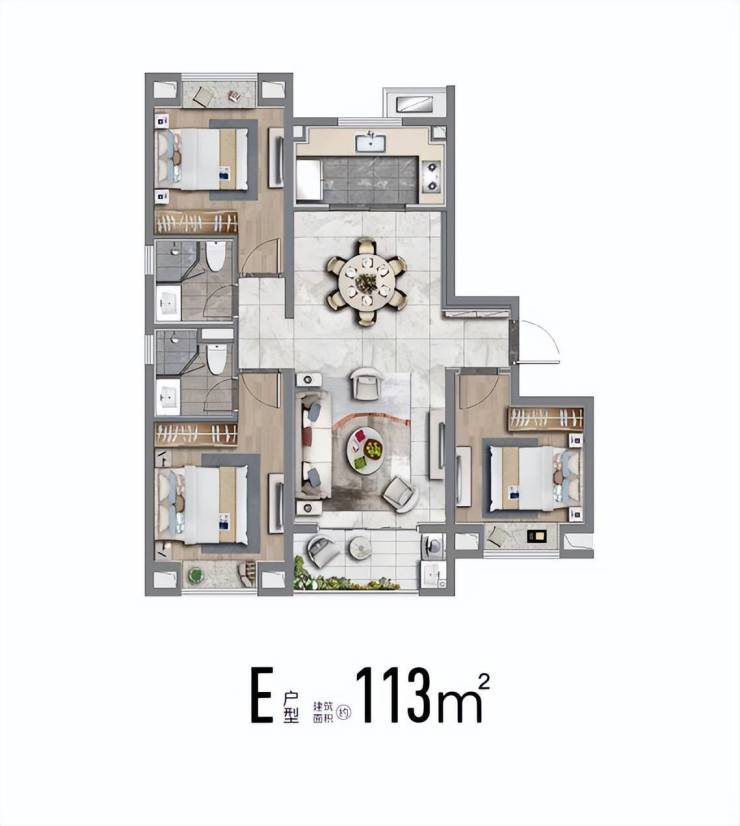 也有建面约113m²舒适性三房,南北通透;飞机户型,房间分列两侧互不打扰;卧室空间也相对更大、更舒适。