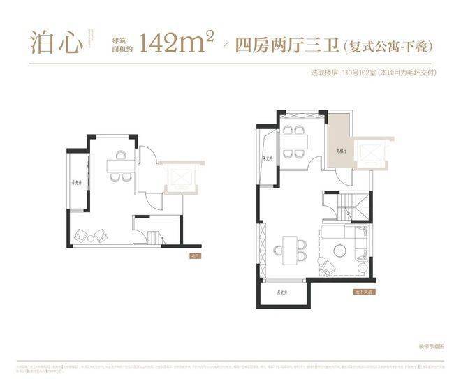 下叠建面约142㎡的四房两厅三卫,大华梧桐院售楼处电话☎:400-8787-740【预约☎】则附带大面积地下空间,可以根据兴趣爱好进行空间布局。