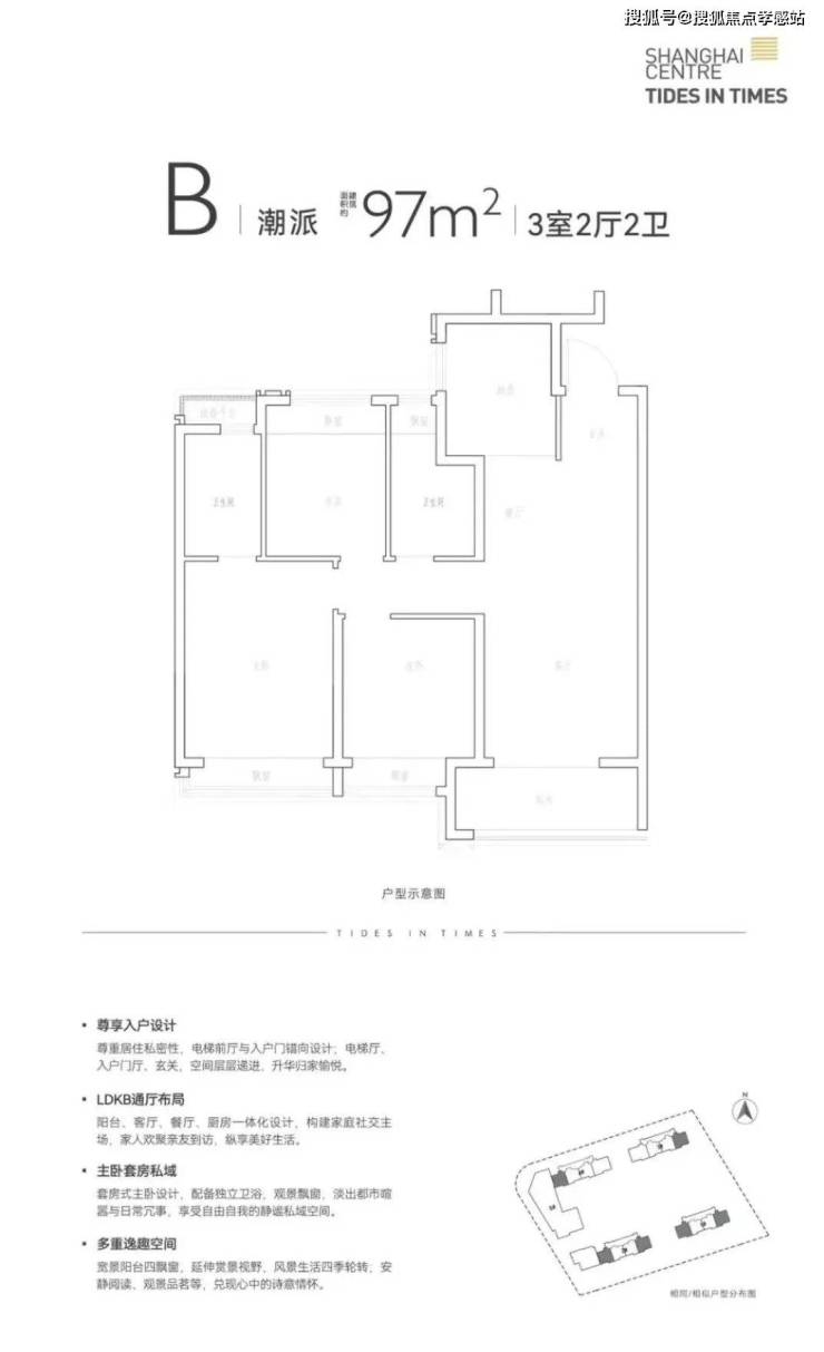 建面约95-97㎡3房2卫,户型3开间朝南+T字动线+动静分离,主卧也设计了套房,让室内采光、通风、私密性都做了进一步升级。