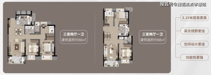 · 建面约88㎡3房:大虹桥范围不到90㎡的户型大部分都只做到2房,而虹桥灿耀星城该面积段实现3房功能性,让自住客户一步到位,也让该产品进入二手市场后具备降维打击的优势!