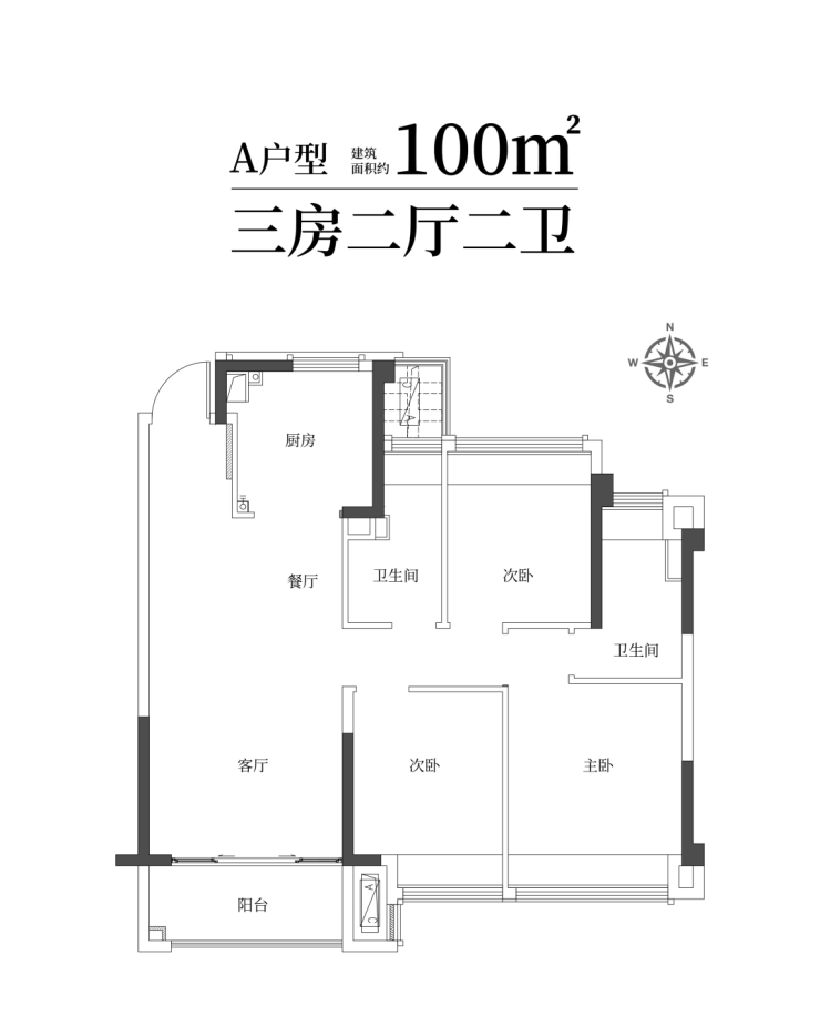 建筑面积约100㎡雅致三房两卫,满足二娃时代