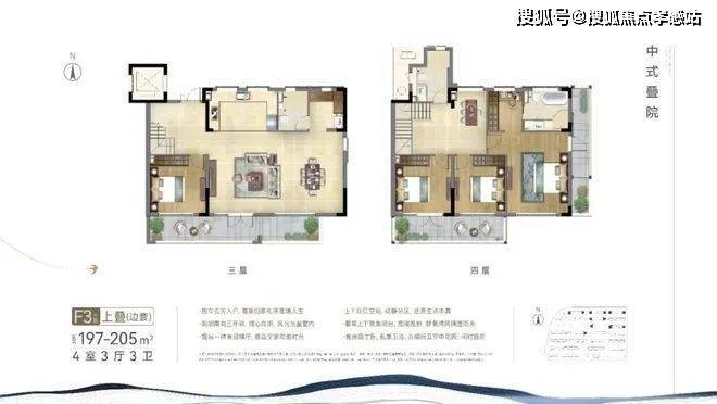 项目中叠户型方正,三开间朝南,最大限度的采光,同时功能齐全,居住舒适。这个户型从街巷的北侧入户,与下叠的南侧入户形成分流,很好地提高了私密性,大门入户是中式的门头,尽显中式韵味。