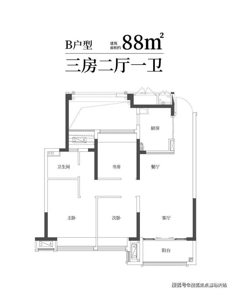 建筑面积约88㎡精雅三房一卫,三口之家理想;