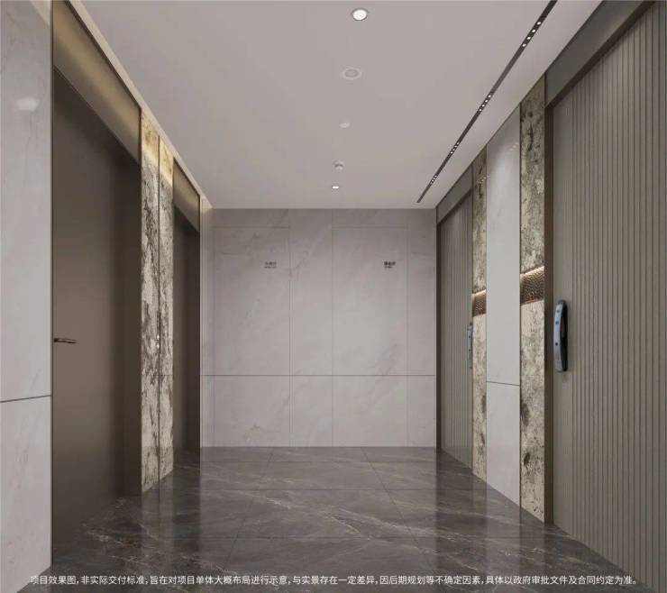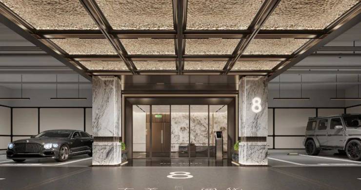 高定地下入户大堂,延续首层入户大堂材质高标,精选雪山银狐天然透光奢石,营造精奢生活质感。