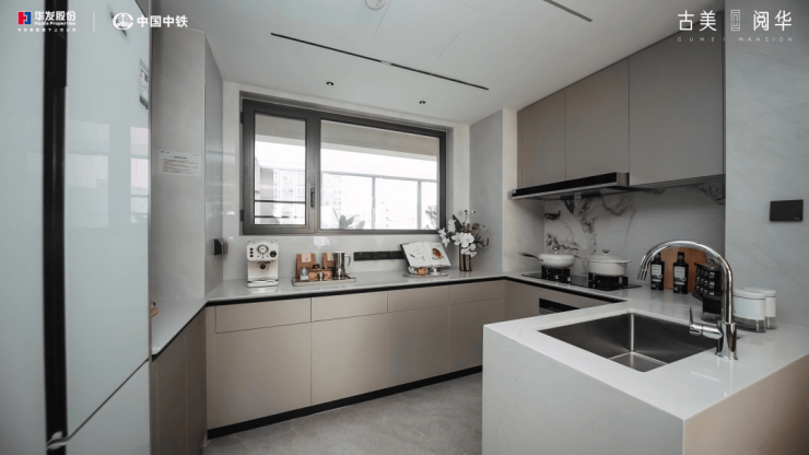 古美阅华在装修上使用大量奢石元素,凸显尊贵的艺术格调比如客厅背景墙、厨房挡油板选用了芬迪白岩板,浴室柜台选用了原产地为意大利的烟雨江南石材。