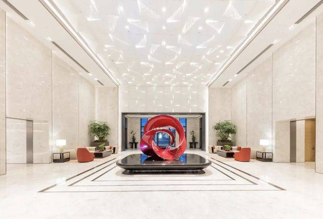 再来看看人行入户大堂,挑高的精装大堂搭配宝华标志性的太阳花装饰,连天花板都嵌入了星空灯光,整个大堂仿若拥有了星级酒店的落客体验。