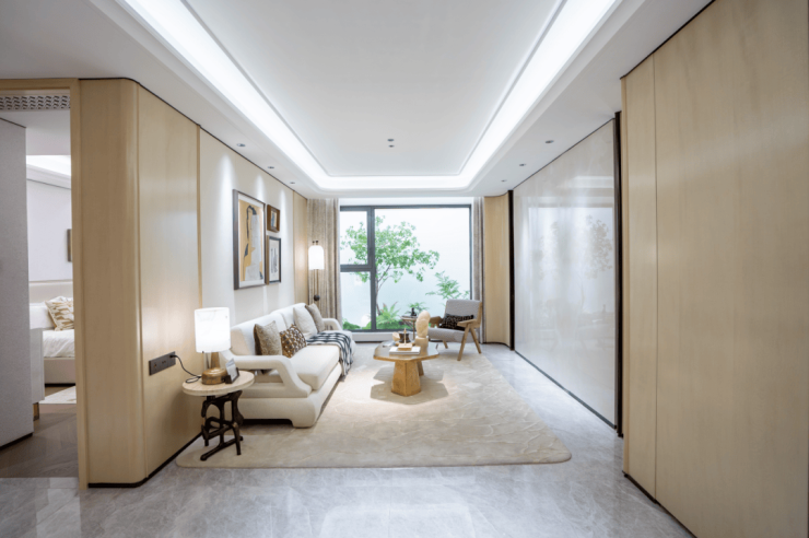 室内墙面大面积铺设温润质感的木饰面,墙面转角处采用曲面处理,为空间注入温馨舒适的居住氛围。