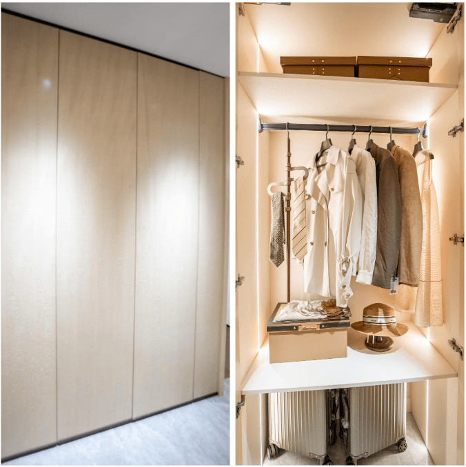 最令人惊艳的,莫过于项目将原本易被忽略的过道转化为实用收纳区——打造了少有的“过道柜”,无论日常衣物、换季的厚被子,还是不常用的生活物件,都能在此找到规整安放的位置。