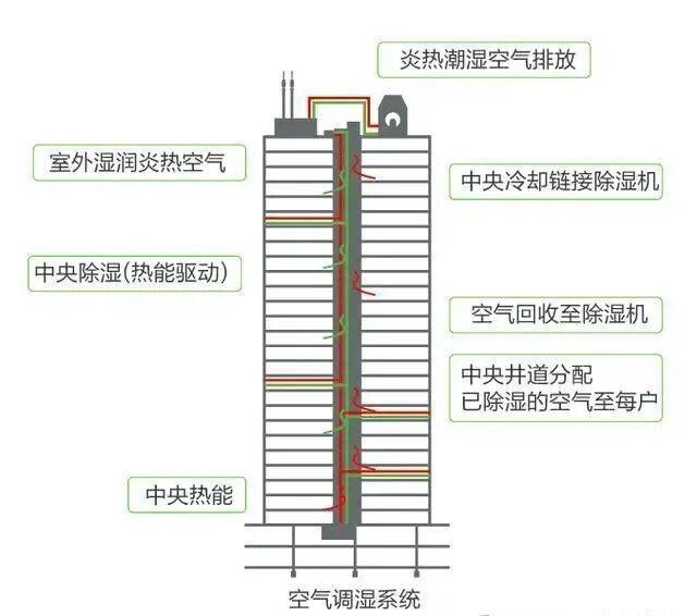 除湿原理:室外高湿的空气被送风机吸入新风机组,遇到新风机组里的冷盘管(冷盘管里的7℃冷水,来源于中央能源系统的冰蓄冷系统),高湿空气的水分子被稀释出来,冷凝水滴到积水盘,再通过排水管排出去,留存下来的就是低温干燥的空气,送入室内。