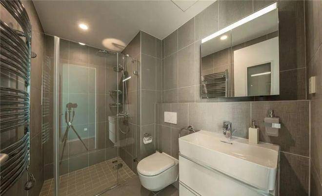 浴室的设计亮点在超薄的蓝钻陶瓷,这种陶瓷采用的都是紧边半径设计。压槽模式被精致坚固的外壁所取代,反而打造出极简的建筑线条。