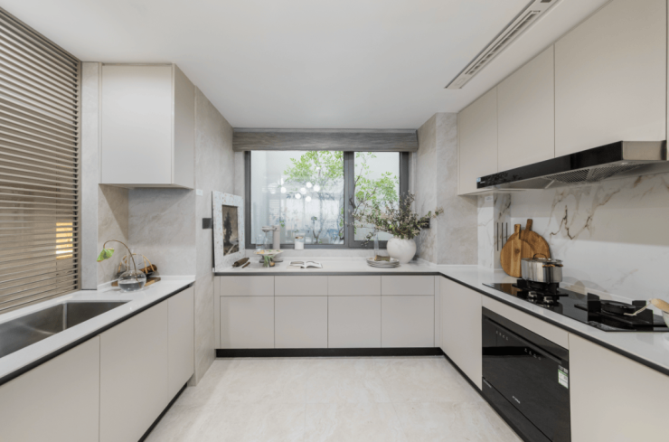 进入厨房,燃气灶、油烟机,洗碗机、水槽龙头等大牌精装一应俱全。