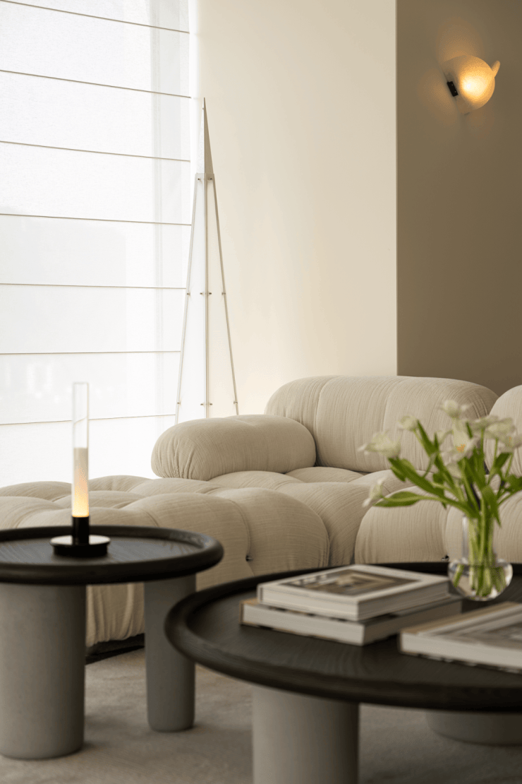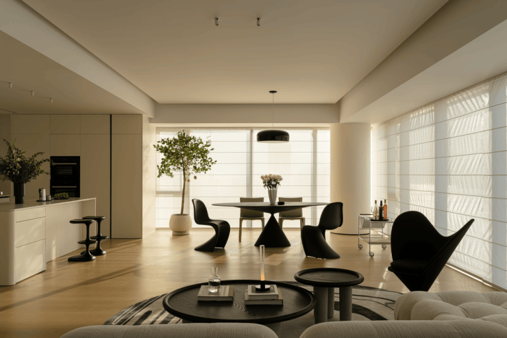 全开放式设计,岛形沙发打破边界,让交流随光影自由发生。午后的光线从侧面洒落,家具被赋予立体的光影层次。