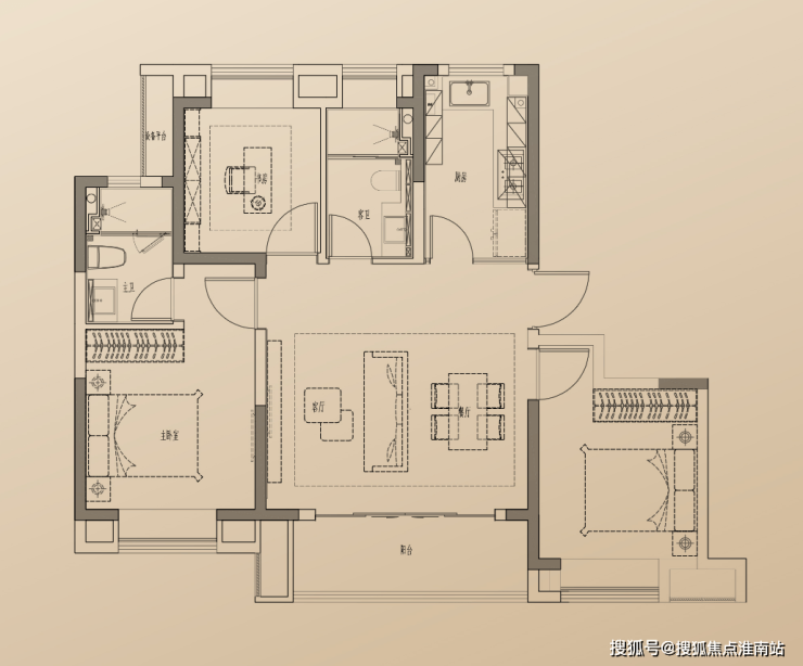 建面约100㎡3房2厅2卫,做到了同面积段中少有的横厅+大阳台设计,餐厅、客厅、阳台一脉相连,居住尺度不断向外延伸。无论日常的休憩、玩乐亦或者是会谈来客,宴请朋友都显得从容大方。