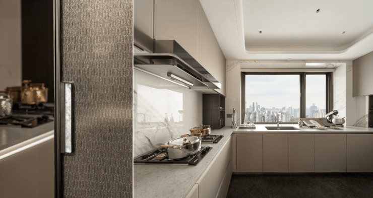 厨房内竹纹夹丝玻璃门、威乃达坡璃烤漆橱柜、与卡拉拉金大岩板台面相融,同时嘉格纳十件套满足每一种味蕾的偏好,厨房内,灶台/油烟机/洗机/冰箱(独立分体设计)五件套;向外,嘉格纳咖啡机/暖碟机/酒柜/烤箱/蒸箱等西厨五件套配置,构筑中西共融的烹饪场域。