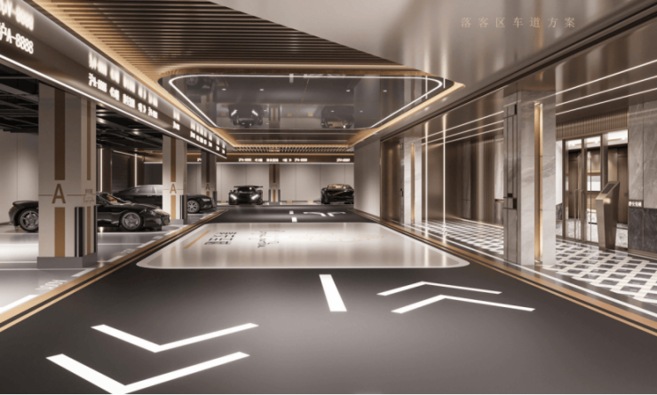 项目车库采用贯穿式鱼尾灯坡道和超耐磨地坪,过道全部采用精装吊顶,地下管道和局部区域进行二次包裹!尤其惊艳的是项目的豪华车马厅,采用水磨石、水晶漆、铝饰面、大板砖、立柱石材包边、门禁系统三合一!
