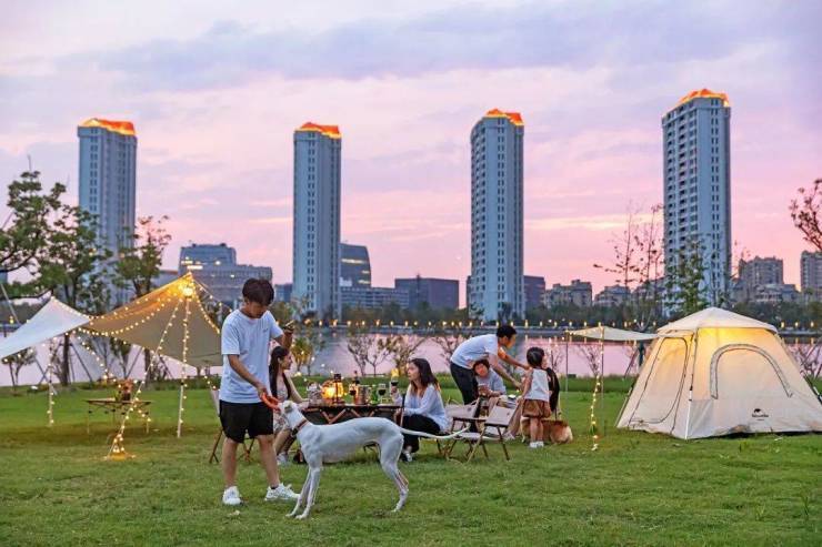 周末的兰香湖,人们携家带口来野餐、露营,亲近大自然,湖边草坪上架起一顶顶帐篷。运动爱好者,可以在近4公里的湖岸边自由骑行或相约夜跑。简直是遛娃遛狗的圣地,孩子们疯玩一天不厌倦,如同度假一般享受。