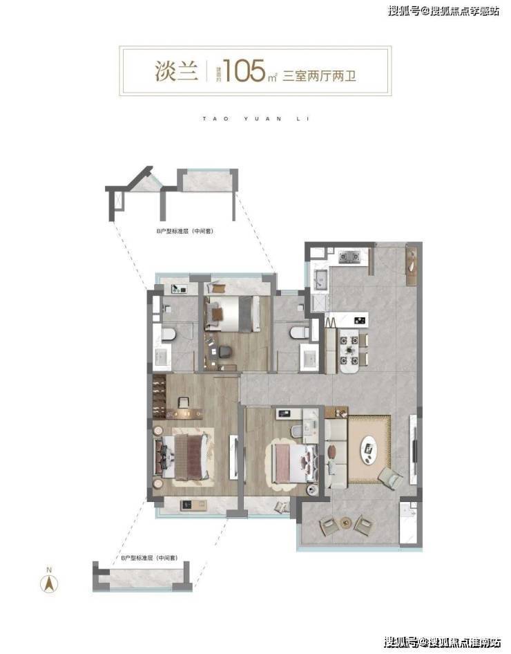 户型设计方面,105㎡样板间打造标准的三开间朝南设计,加之约3.1米的层高配置,整体居住体验明亮开阔。