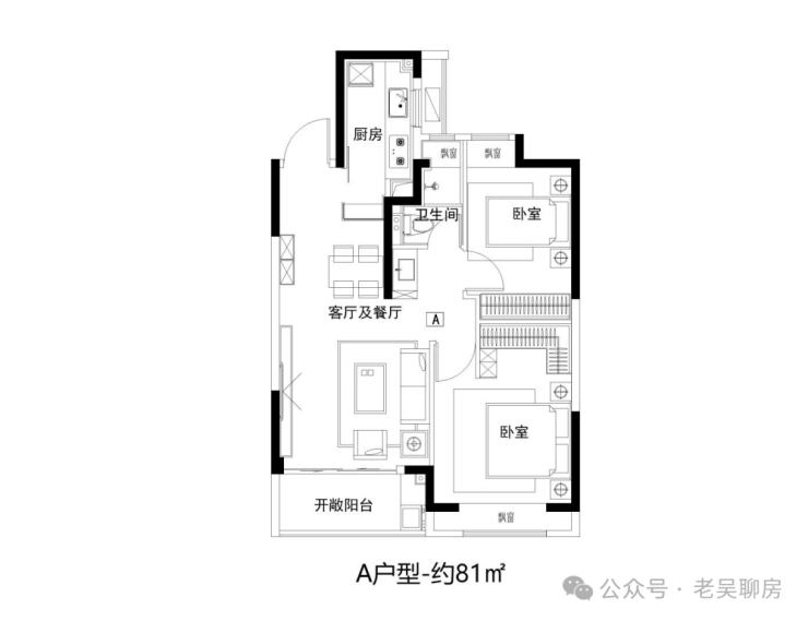 建面约81㎡2房功能齐全,拥有朝南大面宽和全卧飘窗设计。