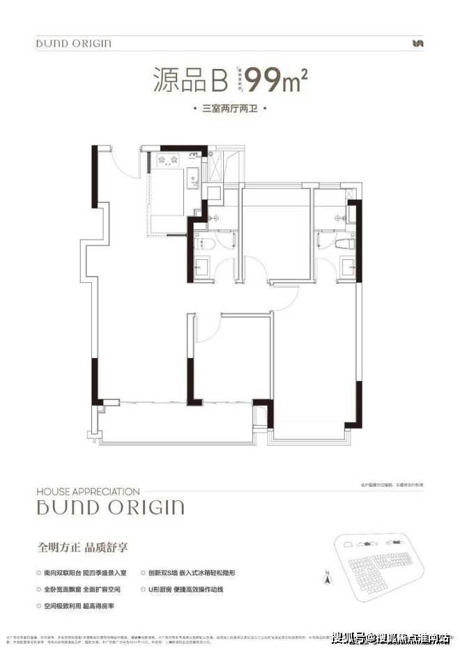 B户型是3房2厅2卫格局,三开间朝南+LDKB一体化+奢阔宽厅+全卧室带飘窗+主卧套房设计+动静分离+主卧270度飘窗,舒适度更高。外滩源著复兴里售楼处电话:400-8855-420✿✿