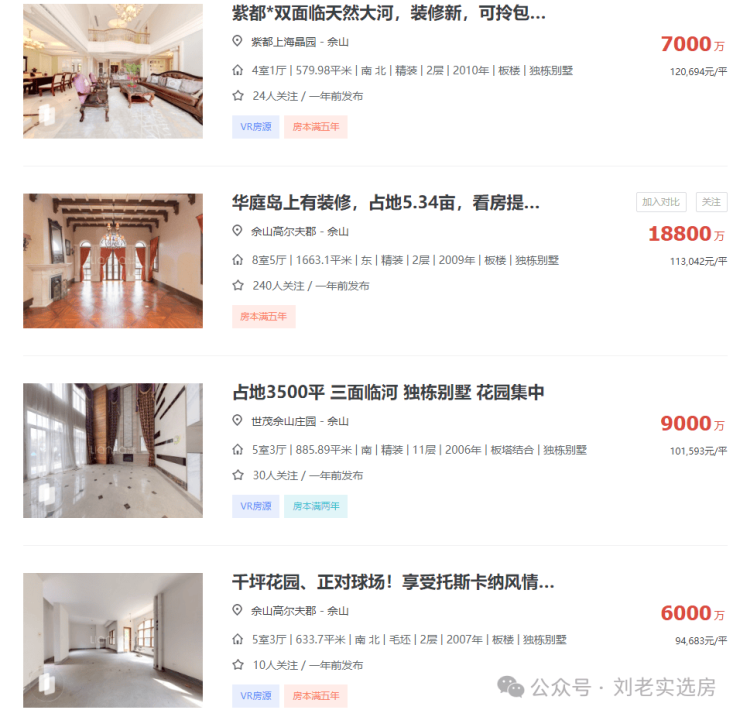 打开链家网不难发现,区域内的别墅项目动辄千万起步,三四千万的总价更是常态,甚至是上亿级别的别墅都比比皆是。