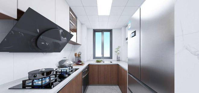 厨房为U型布局,配置定制橱柜、老板烟灶、林内热水器,台面为人造石,水槽为邦克台下盆,细节处体现人性化考量。