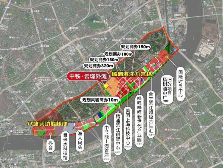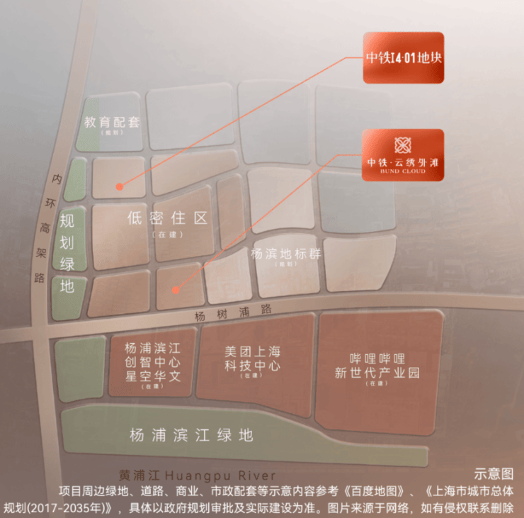 块属于杨浦滨江“九宫格”之一,紧邻内环高架、12号线宁国路站,直线距离滨江约700米。地块北面是一所九年一贯制学校,南侧是中建壹品·外滩元境;周边还有已经售罄的海玥外滩序BUND98、中建壹品·浦江之星项目。