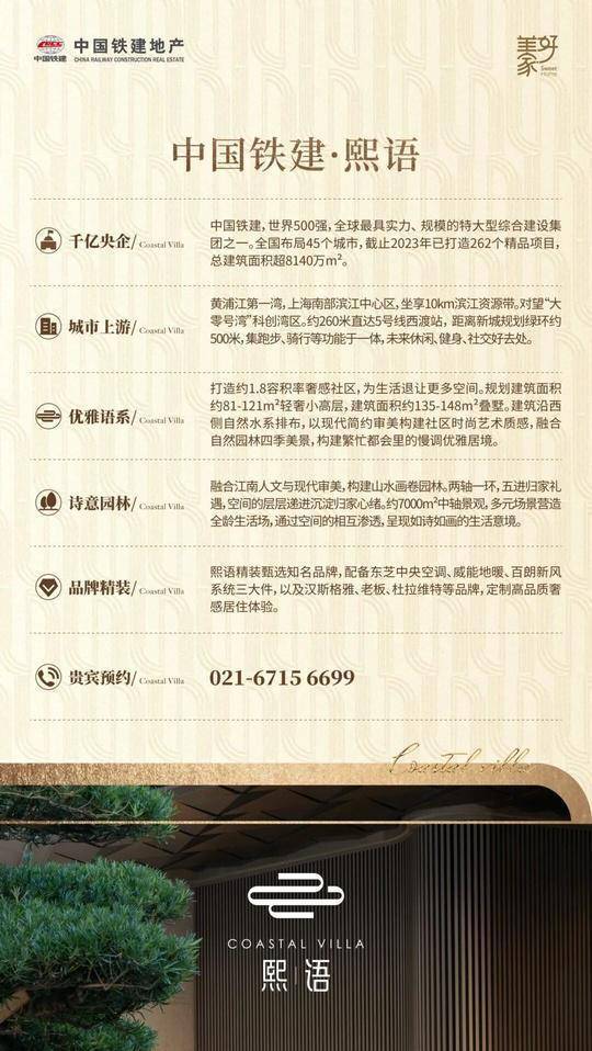 中国铁建·熙语售楼处电话:400-9955-415☎️☎️✅✅✅【售楼处已认证】坐落于上海奉贤区西渡板块,由中国铁建旗下上海京泓润房地产开发有限公司匠心打造,是闵行南区域稀缺的低密滨水墅境住区。项目总占地面积约6.6万平方米,总建筑面积约11.9万平方米,容积率仅1.8,绿化率高达35%,规划1050户瞰景高层与低密叠墅,满足不同家庭的居住需求。中国铁建·熙语售楼处电话:400-9955-415☎️☎️✅✅✅【售楼处已认证】