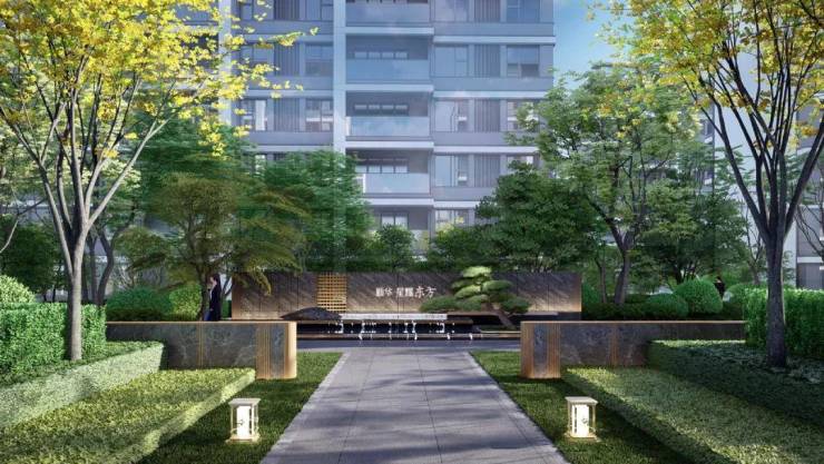 以多种名贵植物的阵列形式,打造星级酒店式入户门仪,同时高层及洋房单元入口更设有约0.9m的高景墙,沉稳质感,营造摩登奢雅的尊崇体验。
