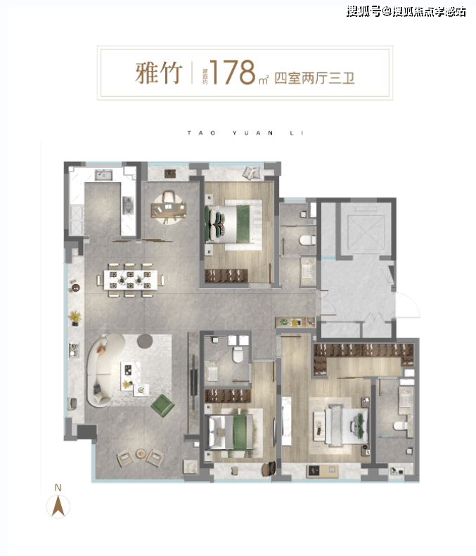 五进式品质归家,构建当代桃源礼序:通过新桃源会客厅社区广场与独立社区会客大堂、林荫归家步道、中央景观聚场、品质入户单元昭示性景墙+专属入户铺装、首层精装大堂五大节点,赋予归家路途更多逸趣与美好。