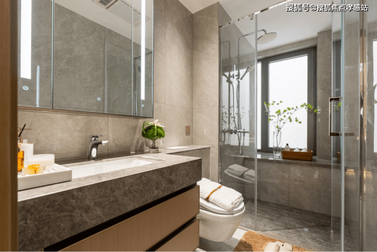 细节相当多,再提一点,卫生间台面都选用天然石材,触感光滑、厚重。