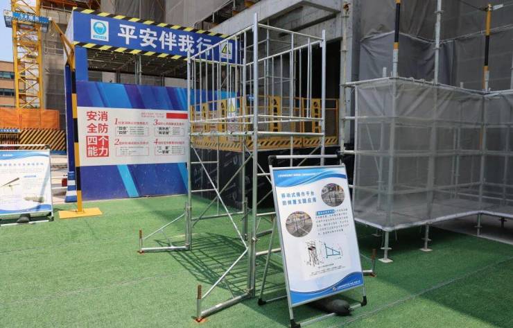 本展区通过展示定型化上下作业通道、生命线系统、移动操作平台防倾覆支腿应用、洞口防护及各类登高车等设备与防坠落措施,体现了项目的安全施工标准化水平。
