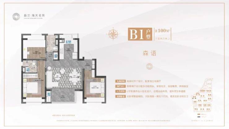 1、建面约100㎡三房两厅两卫,市场主流户型。客餐横厅设计配多功能阳台,优势在于更大采光面和更好通风效果,把过道纳入到客厅和餐厅的空间中来,使整体空间得到更好的利用。☮🔥森兰海天名筑售楼处电话:400-8787-740👈🔥