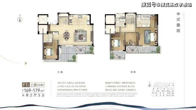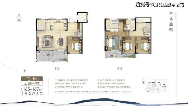 项目中叠户型方正,三开间朝南,最大限度的采光,同时功能齐全,居住舒适。这个户型从街巷的北侧入户,与下叠的南侧入户形成分流,很好地提高了私密性,大门入户是中式的门头,尽显中式韵味。