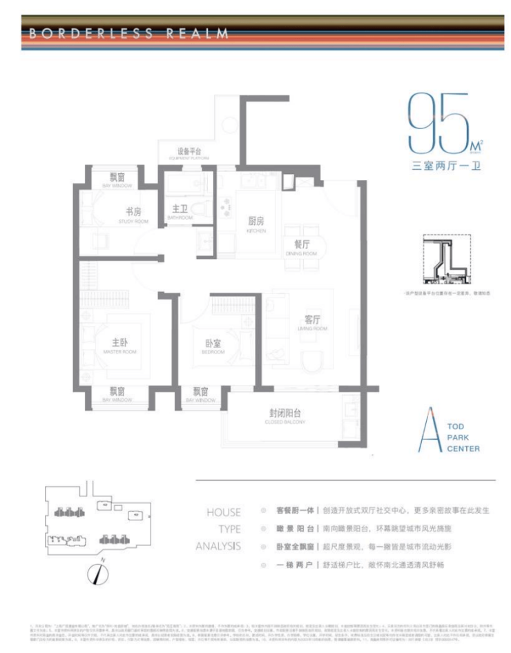 建面约95m²户型特点:开放式厨房,极度释放厨房与客厅的尺度与互动可能,无连廊设计,一梯两户极致梯户比,南北通透舒适感