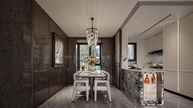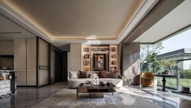 项目采用鎏金塔冠造型,灵感来源于国际邮轮港的曲线,流光美学的外立面,既有辨识度又有质感,是未来业主身份的象征。阳光倾泻而下,在不同光影与环境下,让家成为一件艺术品。