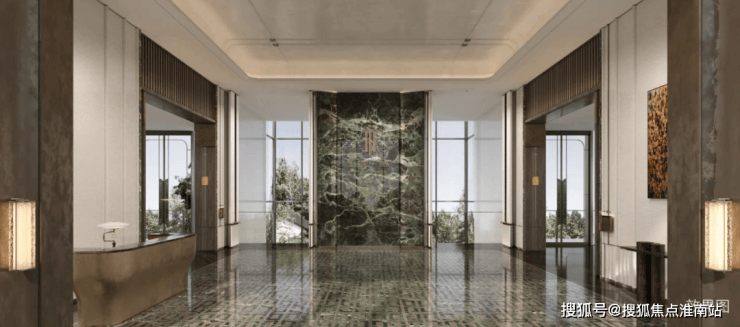 深研三段式的立面设计,顶部香槟色及香槟色格栅,标准层中灰色饰面,横向线条装饰,入户大堂顶部香槟色铝板星空顶满载仪式感,勾勒精致奢华建筑表情,致敬经典,境呈雅致。
