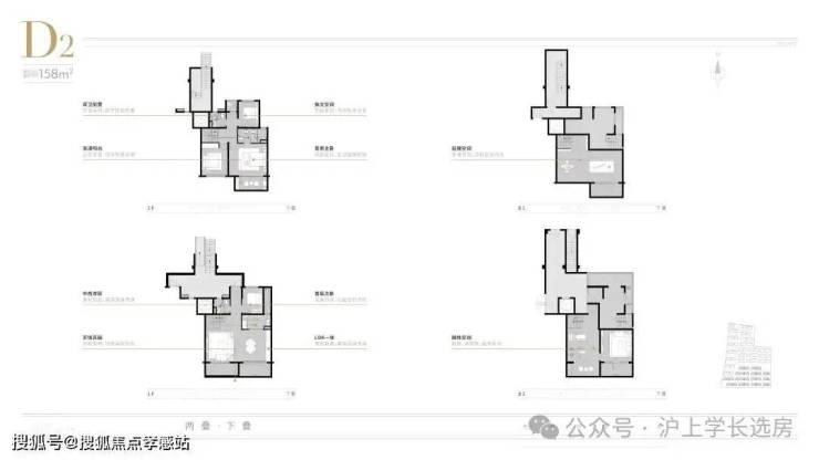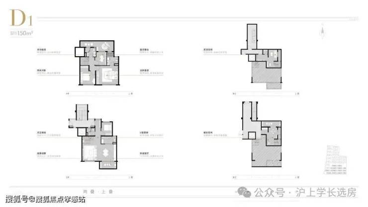 项目上叠分层而居,下层活动空间,南向大开间+南北通透,采光通风性能佳,尺度开阔;上层居住空间,主卧套房设计,北接星空露台;