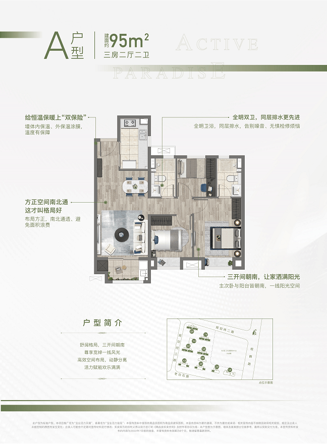 1、约95㎡的三房,南北通透,全明设计,三开间朝南,户型方正。