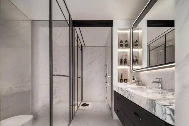 大理石地砖的铺装工艺精湛,近乎看不出拼接缝,呈现出浑然一体的效果;吊顶采用悬浮顶设计,周边用金属包边,层次感十足;卫生间墙面不乏弧形处理,地板纹路的拼法也各有不同,通过复杂的工艺,只为呈现更优的视觉效果。